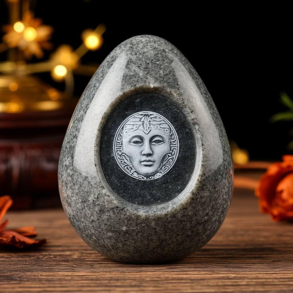 Материал: камень серого цвета с лицом на одной из сторон.