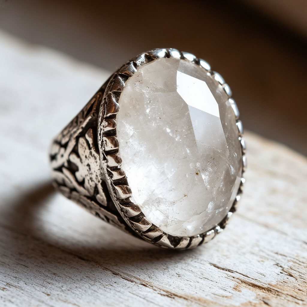 Оправа: тонкая серебряная кайма с гравировкой древних символов.
