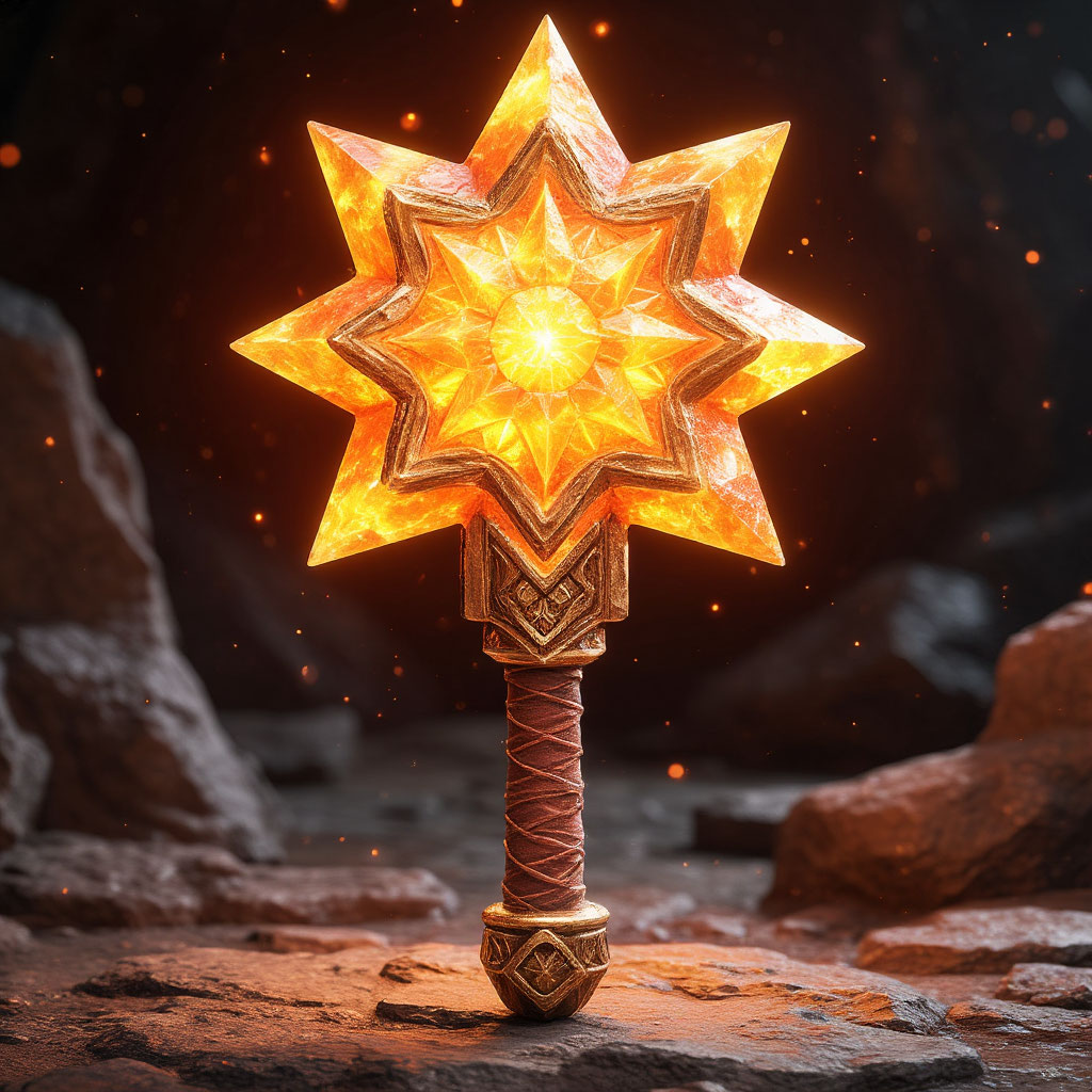 Внушительный боевой молот с рукоятью, выполненной из священного дерева. Боевая часть представляет собой массивную головк в виде звезды из полированного дорнолита, излучающую мягкое золотистое сияние.