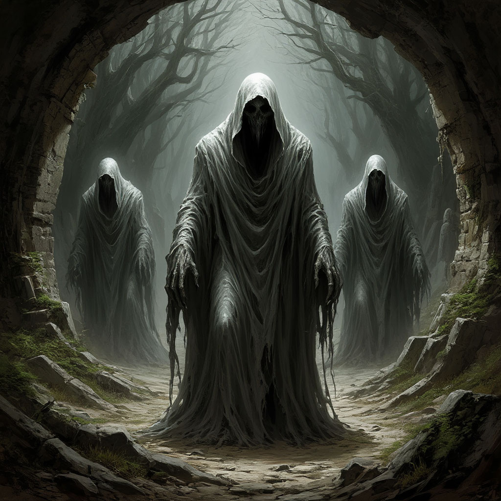 Внешний вид: этих существ представляет собой полупрозрачные серые фигуры, напоминающие человеческие силуэты. Их тела лишены четких очертаний и постоянно мерцают, словно дым или туман.