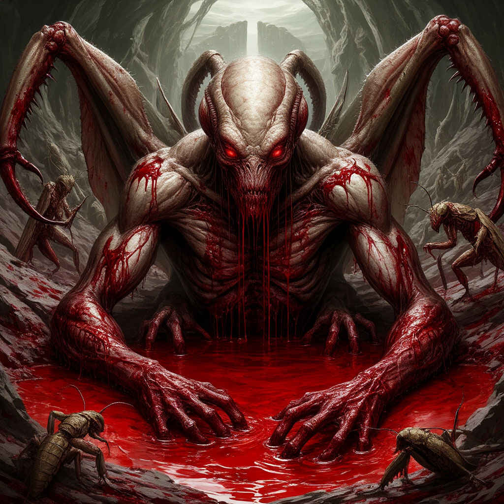 Древний Бог из мира населённого существами похожими на богомолов. Выглядит человекоподобный богомол с руками человека и богомола. Вечно в крови.