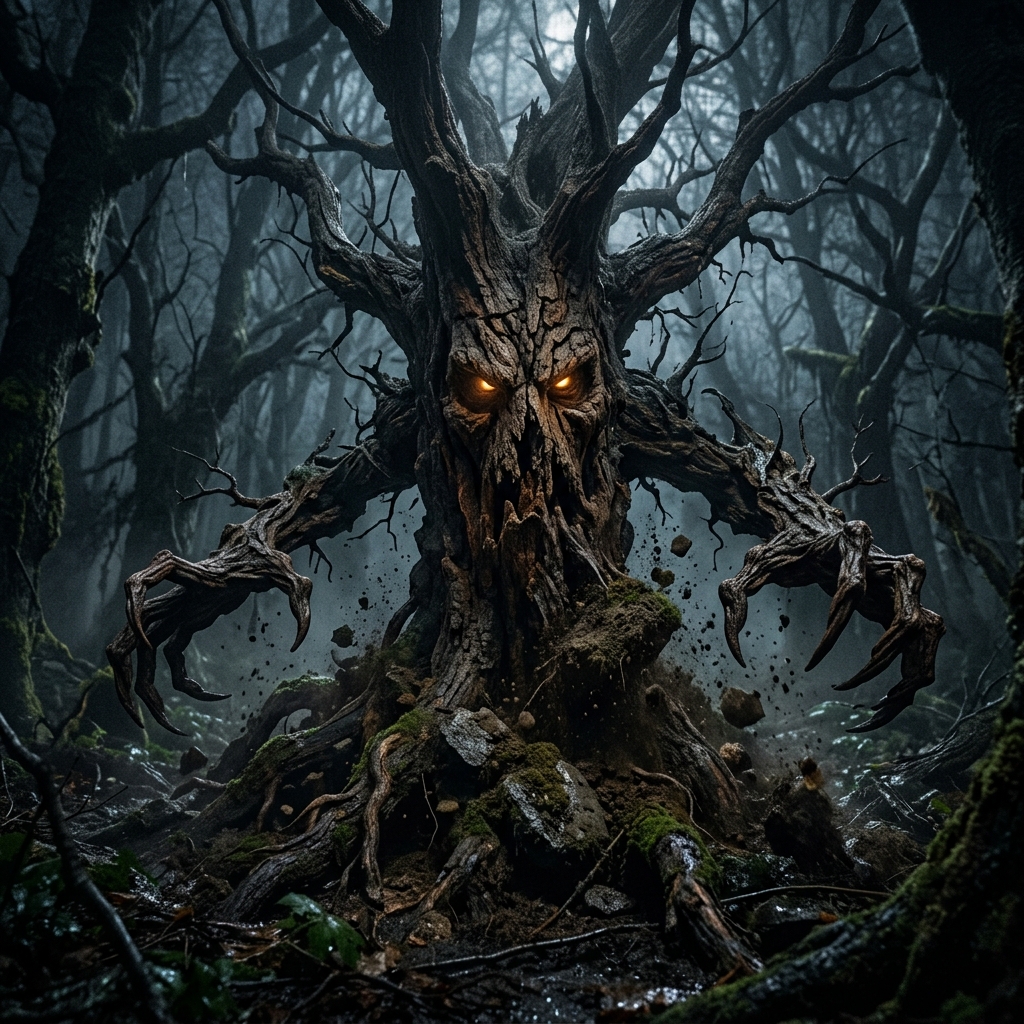 Дрёмки — существа, словно сотканные из противоречий. Внешне они напоминали высохшие деревья с искривлёнными ветвями и шершавой корой, покрытой трещинами. Но стоит путнику подойти ближе, как «дерево» оживало: корни вырывались из земли с глухим скрежетом, ветви изгибались, превращаясь в когтистые лапы, а в глубине ствола загорались тусклые, янтарные огни — глаза дрёмка.
